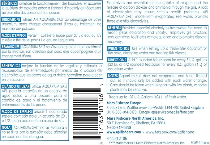 - Contains one (1) API AQUARIUM SALT Freshwater Aquarium Salt 17 Ounce Box