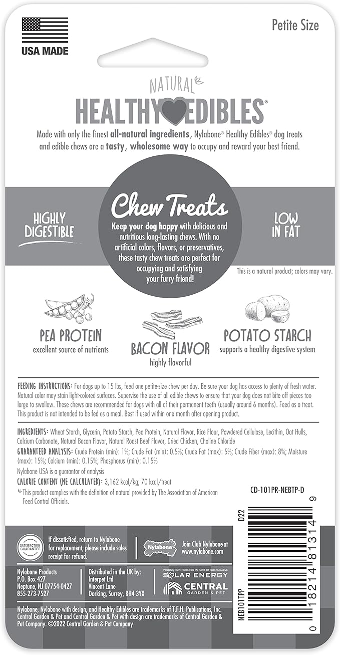 Nylabone Healthy Edibles Natural Dog Chews Long Lasting Bacon Flavor Treats for Dogs, X-Small/Petite (2 Count)