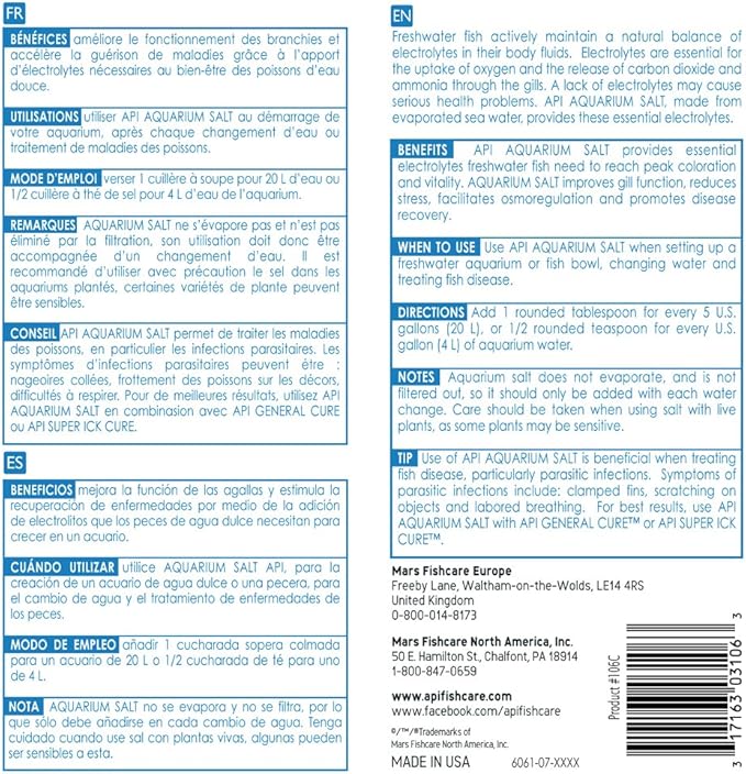 - Contains one (1) API AQUARIUM SALT Freshwater Aquarium Salt 67-Ounce Box