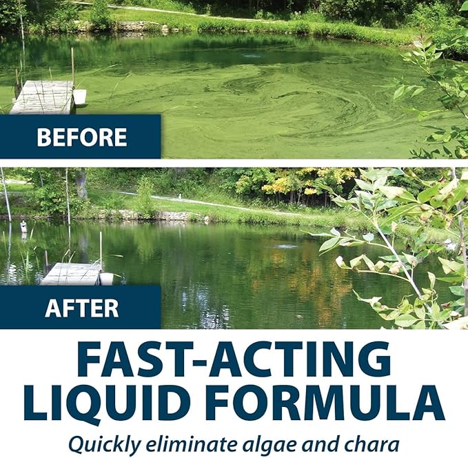 - Liquid Algaecide Kills Algae Fast -- A fast-acting pond algaecide formula that works on a broad spectrum of algae. Provides easy control of floating algae, bottom growing chara, and green water.