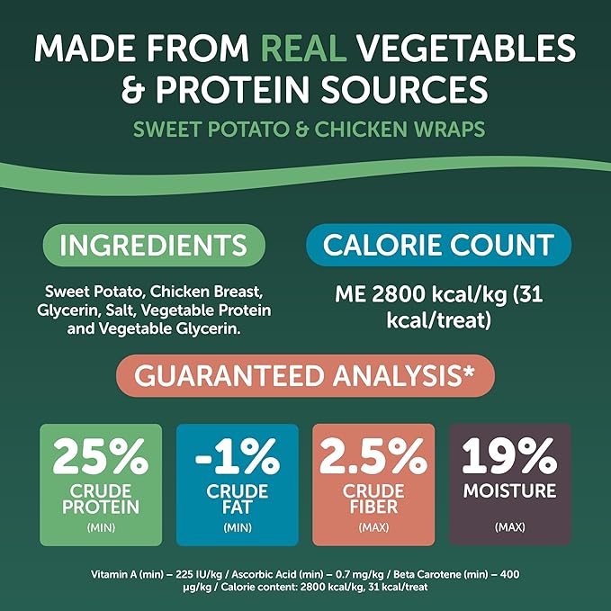- WHOLESOME INGREDIENTS - As nutritious as they are delicious, these treats are made with sweet potato, which is a natural source of vitamin A, and helps to maintain strong eyesight, healthy skin, and a shiny coat. Sweet potato also provides vital dietary fiber and antioxidants to help to support your dog's digestion and overall good health.