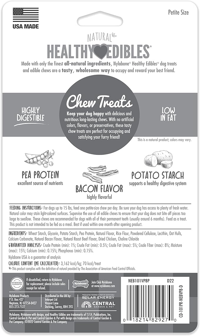 Nylabone Healthy Edibles Natural Dog Chews Long Lasting Bacon Flavor Treats for Dogs, X-Small/Petite (8 Count)