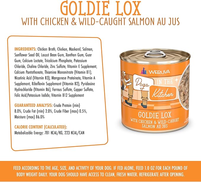 Weruva Dogs in The Kitchen, Goldie Lox with Chicken & Wild-Caught Salmon Au Jus Dog Food, 10oz Can (Pack of 12)