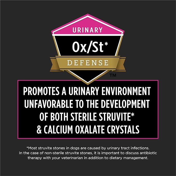 - Great tasting Purina Pro Plan Veterinary Diets dog food promoting a urinary environment unfavorable to the development of both sterile struvite* and calcium oxalate crystals