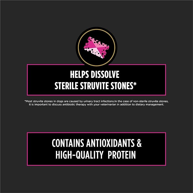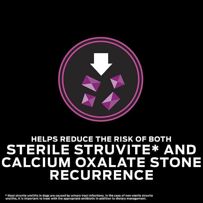 - Great tasting Purina Pro Plan Veterinary Diets dog food promoting a urinary environment unfavorable to the development of both sterile struvite* and calcium oxalate crystals