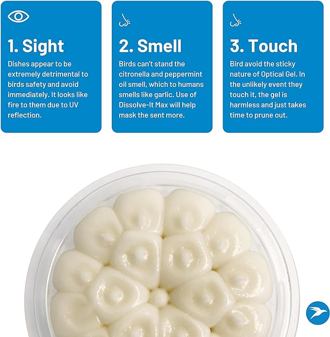 - ALL NATURAL AND SAFE: This bird deterrent optical gel is based on all-natural, ingredients. A proprietary blend of citronella, mint oil, agar, and beeswax create an unpleasant feeling for the birds, having a sticky texture and scent that keeps birds away.
