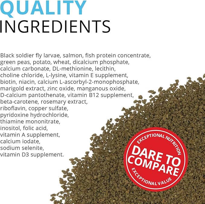 - Tropical fish food that contains up to 40%, nutrient-rich Black Soldier Fly Larvae, the first ingredient