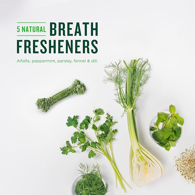 - Promote Good Dog Oral Health: Using Minties dog dental chews daily helps promote oral health and freshens your dog's breath with five (5) breath fresheners alfalfa, parsley, fennel dill, and peppermint