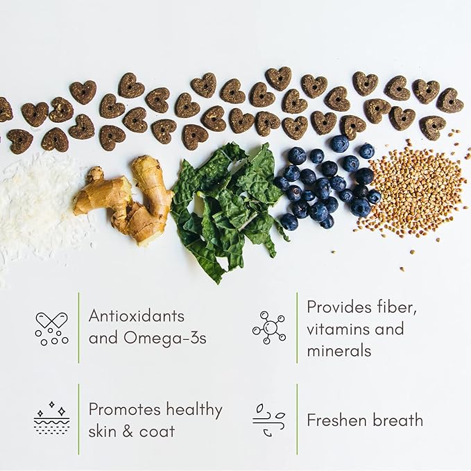 - PLANT POWERED INGREDIENTS: Carefully made with buckwheat flour, coconut flakes, blueberries, coconut oil, kale, ginger, and mixed tocopherols (to maintain the freshness). Easy to digest with highly soluble ingredients leading to a balanced nutrition for all-size dogs.