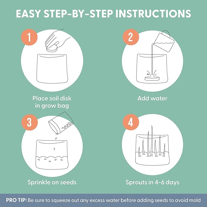 - What’s Inside: Our Cat Grass Growing Kit includes 3 USA-made grow bags (4.7” x 5.5” x 6.1”), 3 soil disks (number may vary), organic seeds for planting edible grass, and simple instructions.