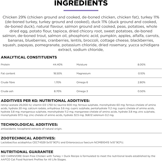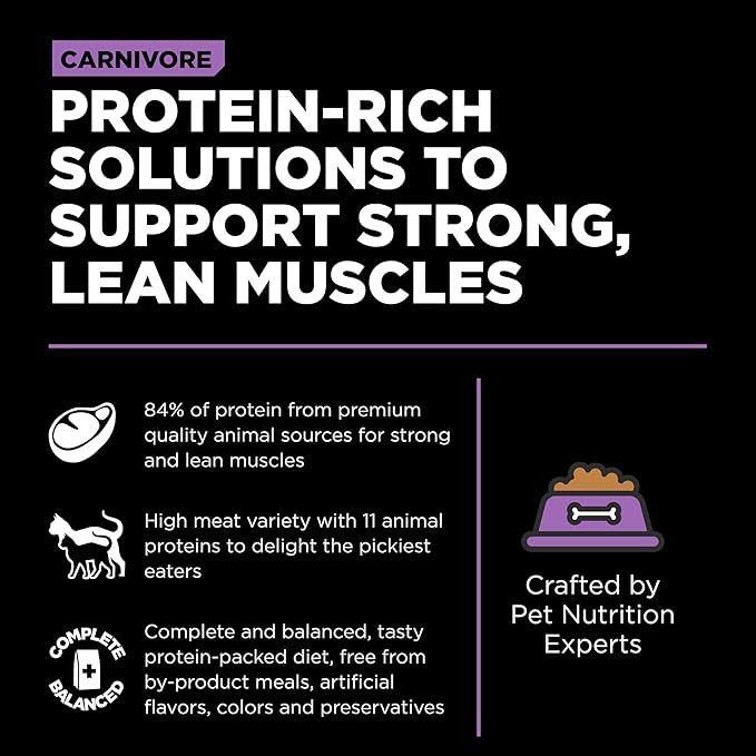 - PROTEIN-RICH FOOD TO SUPPORT STRONG, LEAN MUSCLES: The first seven ingredients and 84% of the protein in our CARNIVORE Chicken Turkey + Duck grain free cat food comes from real premium-quality meat + fish.