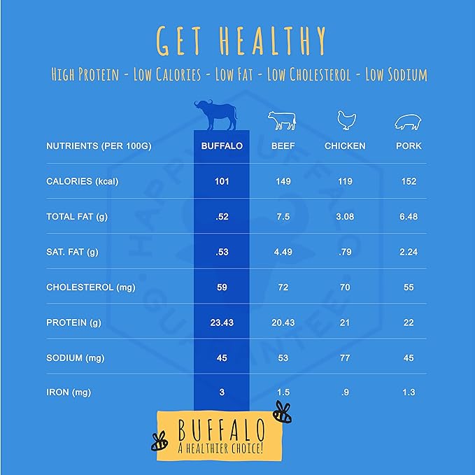- Buffalo is the healthier choice for meat, it's high protein, low calories, low fat, low cholesterol, & low sodium