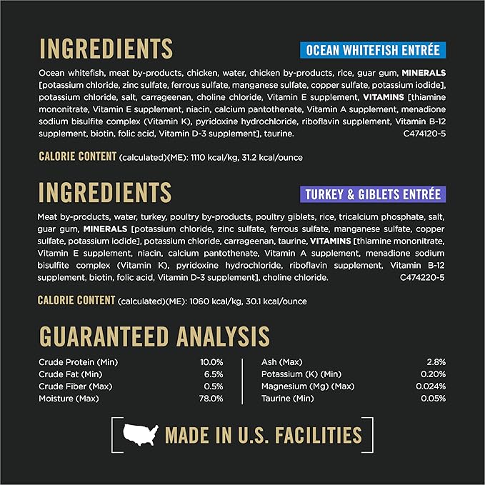 - Pate cat food made with real turkey and giblets or ocean whitefish for a taste cats love