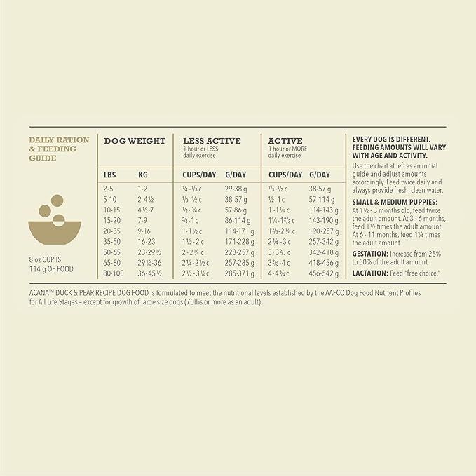 - One (1) 13 lb bag of ACANA Singles Limited Ingredient Duck and Pear Dry Dog Food