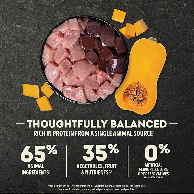 - Made with pork and pork liver, this grain free dog food is carefully crafted with 65 percent*** animal ingredients and 35 percent**** whole fruit, vegetables and nutrients to satisfy your dog’s cravings