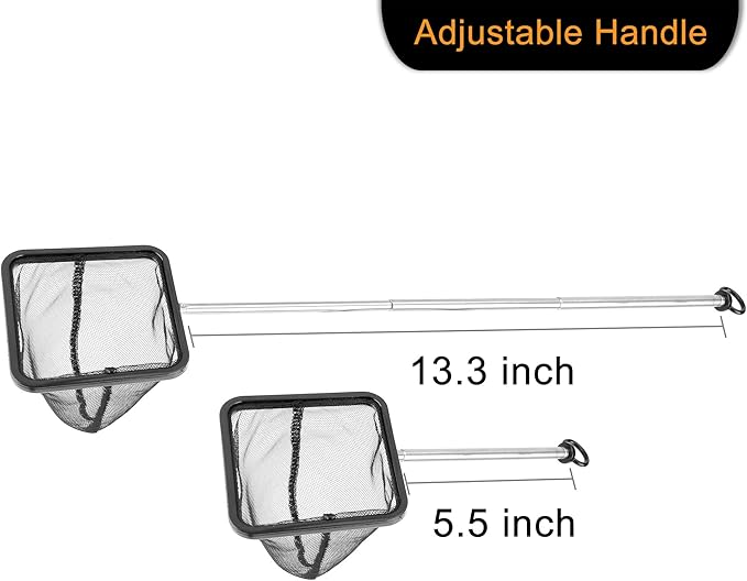 - Multi-purpose: Extendable fish tank net for catching and transfering fish and shrimp. It can also be used as fish tank cleaning net for removing debris, waste or uneaten fish food from your aquarium. Package including 1 pcs aquarium fish net. Please note that this fish tank net is not suitable for big fish and heavy debris.