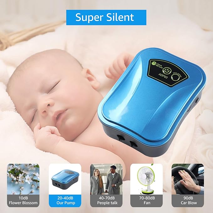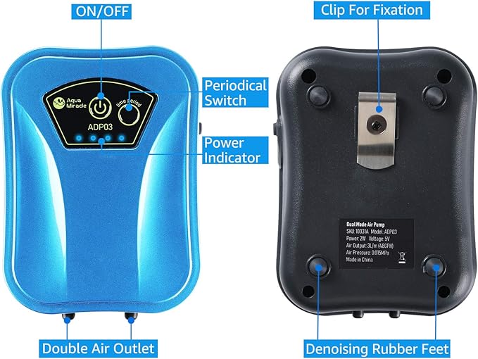 - PERFORMANCE – This compact and super silent air pump is designed with the most updated denoising technology and excellent performance. Flow rate 48GPH (180LPH), air pressure 0.015MPa, Power 2Watt. Good enough for 2-120 Gallon aquariums.