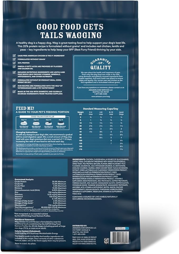 Amazon Brand - Wag Dry Dog Food Grain-Free Chicken & Lentil Recipe, High Protein (24 lb bag)