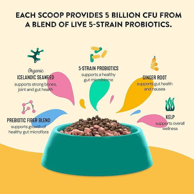 - ALL NATURAL AND FRESH INGREDIENTS: Our dog gut health supplement is crafted with care, using only the freshest natural ingredients and absolutely no artificial fillers. These tasty dog food toppers include a potent combination of 5-Strain Probiotics, Prebiotics, Organic Kelp, Ginger Root, and Organic Icelandic Seaweed blend that work together to promote a healthy balance of gut microflora, digestion, and a robust immune system.