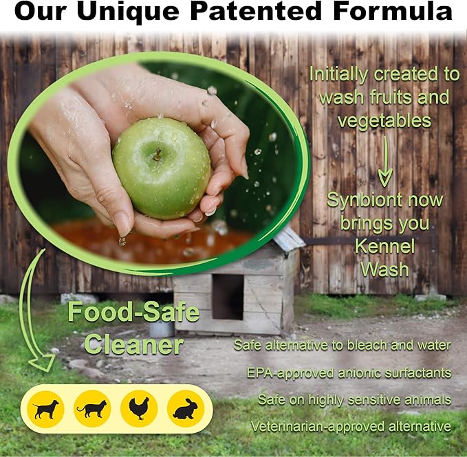 - BLEACH ALTERNATIVE - Unlike traditional toxic sanitizing steps such as bleach or chlorine, Synbiont Kennel Wash allows for an environmentally friendly alternative to cleaning that doesn't require re-entry restrictions, is non-corrosive and can be used freely around your pets.