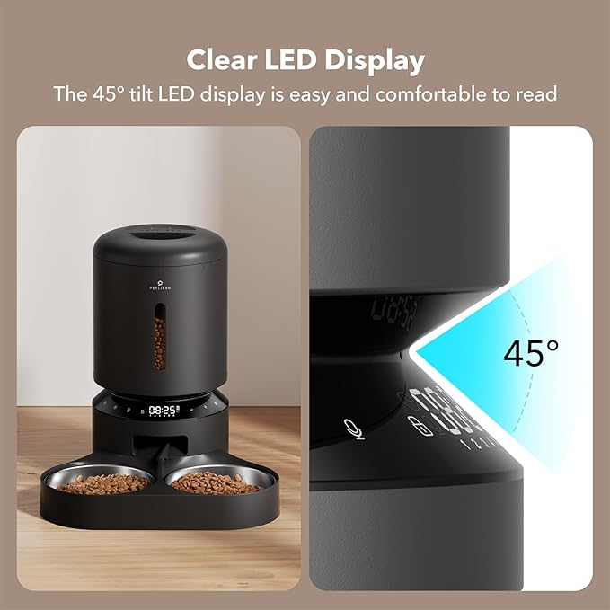 - Easy to Set up and Program: PETLIBRO timed cat feeder can set 1-6 meals daily and up to 50 portions per meal (20ml each portion). Use the easy-to-read tilt LED panel to adjust your pet's feeding schedule and monitor battery power. The Granary auto cat feeder is also equipped with a manual feeding button to easily reward your pet (up to 5 portions).