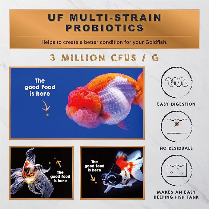 - 3 Million CFUs/g Probiotics : 3 million CFUs/g probiotics are within the food to help dissolve fish excrements, residuals and keeps water clean. Probiotics also increase the feed conversion rate, improve goldfish’s immune system and gut health