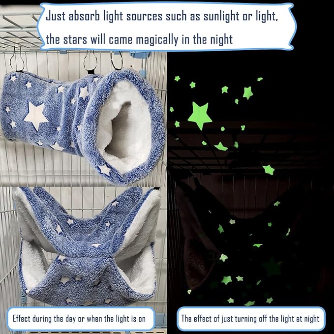- INCREDIBLE NOCTILUCENT PET TOYS: Have you ever seen noctilucent pet hammocks and passages? Just absorb light sources such as sunlight or light, the stars on the hammock and passage can shine in the dark for a period of time, which will bring your pet a new and unparalleled entertainment experience.