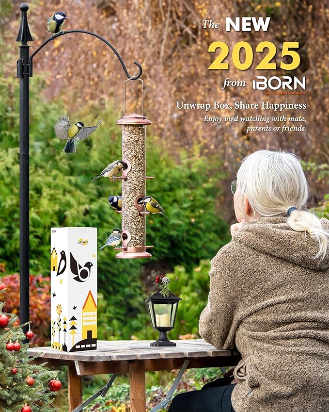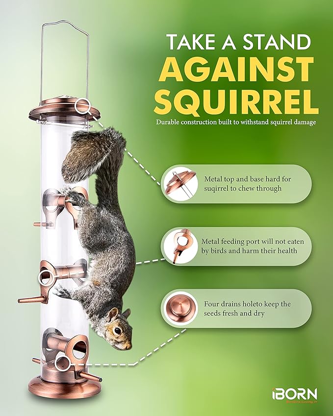 - 【Metal Bird Feeder】Metal top & base, aluminium feeding ports survived from Squirrel Damaging. Durable quality to sustain wear and worn outdoors. We adopt advanced technique for metal finishing to help the metal last longer when used outdoors.