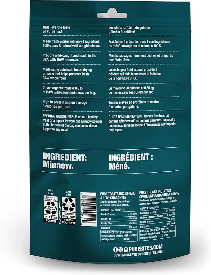 - Made fresh & pure, using a delicate freeze drying process that helps preserve fresh RAW whole food; with 0.8lb of RAW minnow and 90 treats per 2.3oz bag, our bags are packed with more protein and nutrients