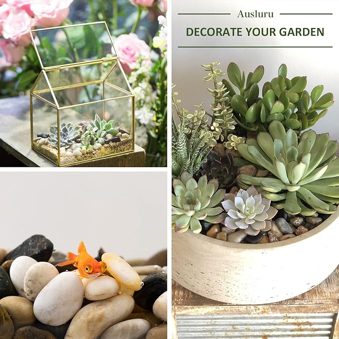 - 【Natural Rocks Stones】Ausluru river rocks are high quality and non-toxic and eco-friendly. Decorative rocks are a permanent and cost-effective alternative to annual wood mulching. Their natural attribute will make them last longer because they will not deteriorate like mulch does. After being immersed in water, nothing will float, and the color will not fade after a period of time.