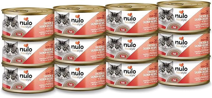 - CHICKEN & SALMON - Nulo Freestyle Cat & Kitten Wet Pate Canned Cat Food features our proprietary blend of grain-free proteins and vitamins ideal for cats with diagnosed grain allergies and sensitivities. Pack of 12, 2.8 Oz each