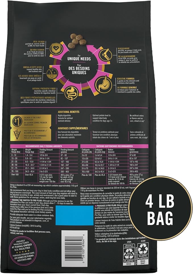 Purina Pro Plan Sensitive Skin and Stomach Dry Dog Food Senior Adult 7 Plus Salmon and Rice Formula - 4 lb. Bag