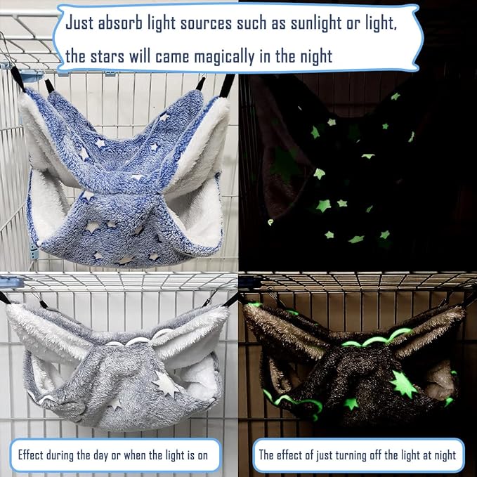 - INCREDIBLE NOCTILUCENT PET TOYS: Have you ever seen noctilucent pet hammocks and passages? Just absorb light sources such as sunlight or light, the stars on the hammock and passage can shine in the dark for a period of time, which will bring your pet a new and unparalleled entertainment experience.