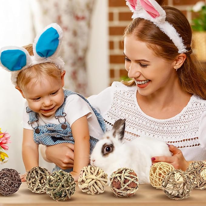 - Our bunny chewing toy set includes 6 grass balls of different texture,Diameter approximately 3 inches, 1*Skinless Rattan Ball, 1*Brown Skinless Rattan Ball, 1*Seaweed Ball, 1*Corn Leaves Ball, 1*Seaweed +Corn Silk Ball, 1*Skinless Rattan +Seaweed Ball. It's a great gift for furry friends.