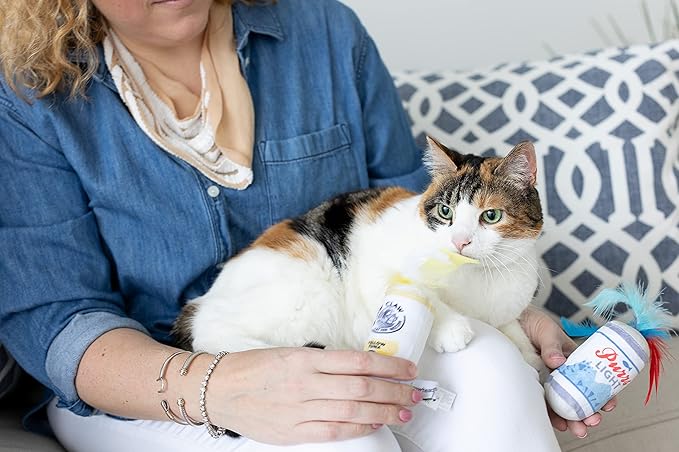 - Includes two plush cat toys with catnip: one crinkle “purrs light” and one “yellow tuna meow claw,” each with feather teasers