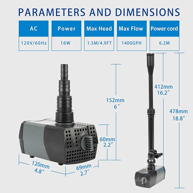 - Easy to Maintain: This submersible pond pump can be fully detachable,no tools necessary for disassembly. So this fountain pump is very convenient and easy to clean. You do not need to take too much time on maintenance.