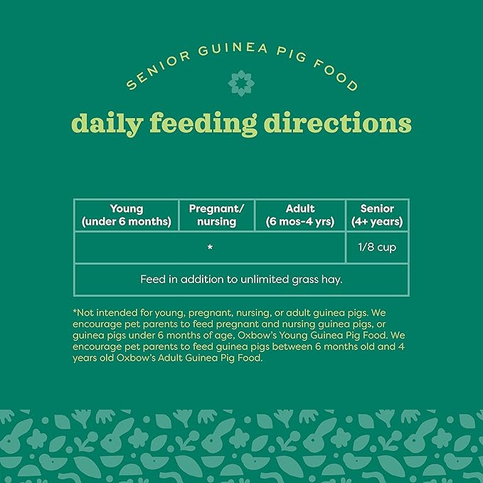 - VET-FORMULATED: Oxbow Senior Guinea Pig is formulated with the guidance of leading vets and made with wholesome ingredients right here in the USA; Our trusted senior guinea pig diet provides balanced nutrition and consistency for older pets