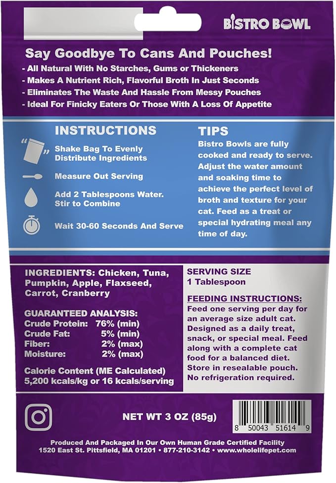 - SAY GOODBYE TO MESSY MEALS: Tired of wrestling with cat food broth pouches? With Whole Life Pet Bistro Bowls, just add water for an instant, lickable cat food topper that keeps your furbaby hydrated, happy, and hungry-no-more.