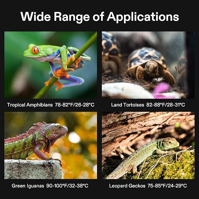 - Intelligent Constant Temperature: This reptile heat pad can get well about 104℉(40℃) ; Use this Digital Thermostat to monitor the temperature of your terrarium; Regulates and maintains your preferred temperature within a control range of 40–108 ºF (Temperature display range is 32 -210°F)