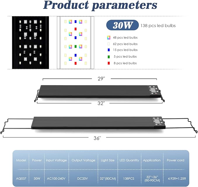 - Multifunctional 24/7 Professional Aquarium Light: Made of thickened aluminum alloy material, quick heat radiation, durable; Choosed 2835 and 5730 beads, high brightness, color rendering up to 89; Light bead panel is fully covered with glue, good waterproof performance; The retractable bracket is suitable for all fish tanks with a length of 12"-54"; Input votage is AC100-240V, Kelvin is 6500K white LED; LED high-definition screen, controller and lamp integrated and wires no longer messy