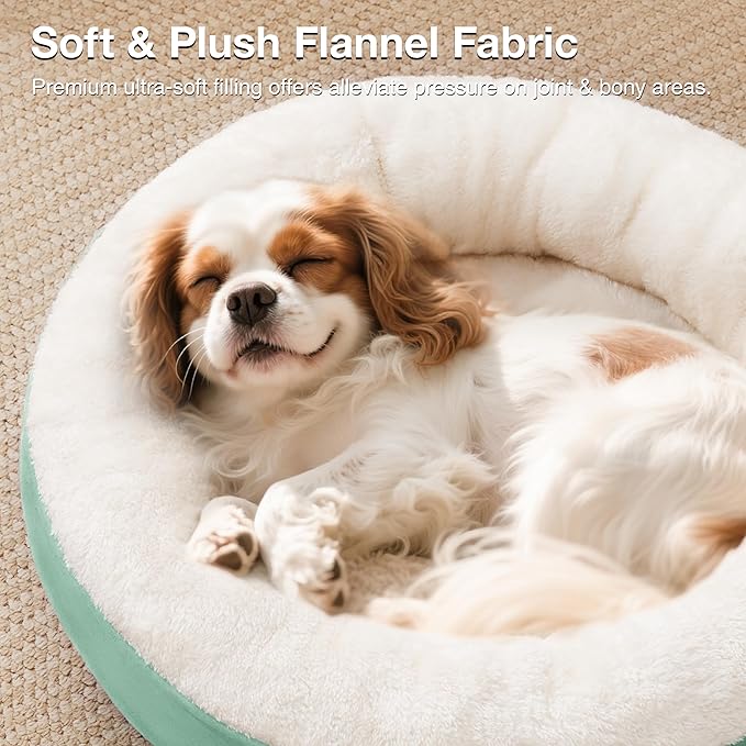 - Donut Cuddler Shape: The round dog bed allows pets to curl up while the raised rim creates a sense of security and provides head and neck support. Premium ultra-soft filling offers joint and muscle pain relief, is a great choice for elderly or sick dog pets. The 25 inch round pet bed is perfect for cat or puppy and other pets up to 30 lbs.