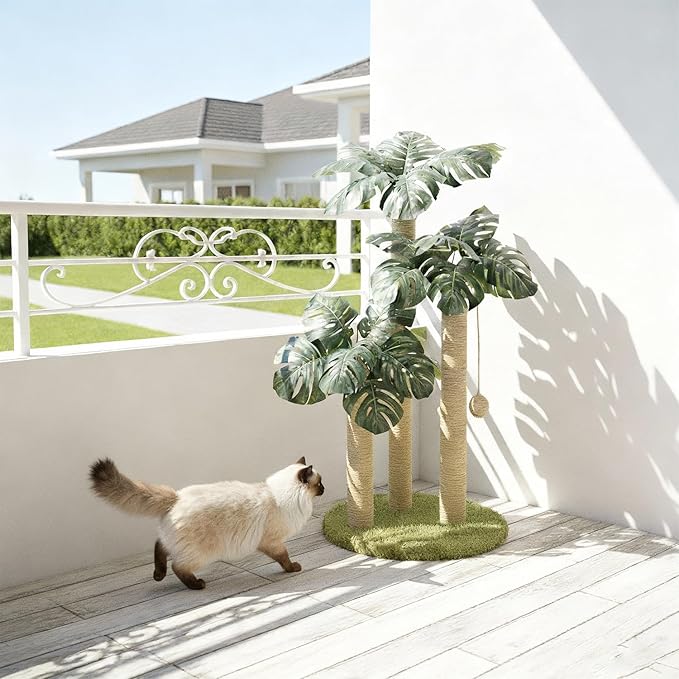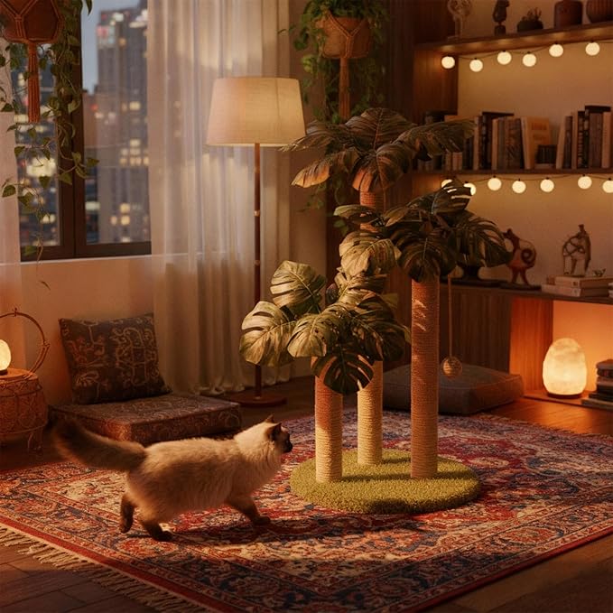 - 【Not only a cat scratching post but also a beautiful decoration】Transform Your Home into a Feline Jungle with Our Forest Cat Scratching Post!Elevate your home decor with this gorgeous 15.75"*15.75"*31.5" High cat scratching post that doubles as a beautiful decoration. With 3 sisal-covered scratching poles, 15 lush leaves, and a carpeted base resembling a tropical forest, your kitty will feel right at home in this jungle oasis.
