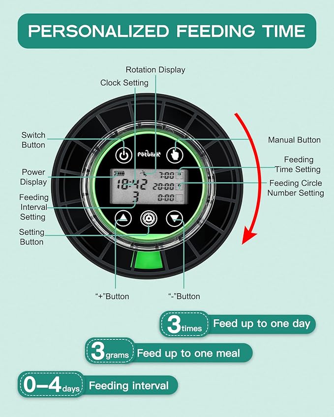 - Customized Feeding Time :With the help of intelligent LCD display and timer function, Our automatic fish feeder can be programmed up to 3 feedings per day, with maximum 3 grids per feeding. You can also set it to feed at any time of the day and have it deliver every single or two or three or four day. If you want to experience the fun of feeding, you can also choose manual feeding