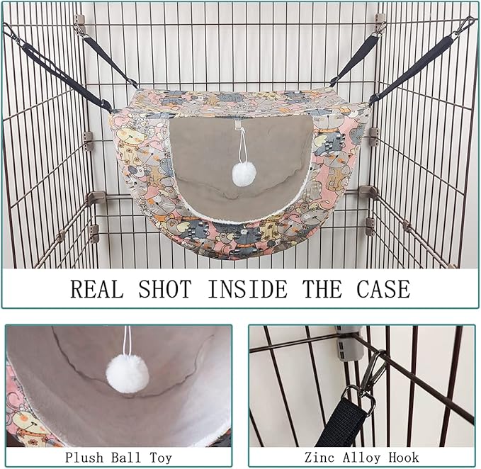 - Upgrade Double-layer Design : Double layer design that accommodate two or more cats to play and rest at the same time. The upper layer of the cat hammock is made of fabric oxford cloth. The inner fleece material is made of faux lambswool. It is suitable for all seasons, providing warm winter and cool summer.The hanging plush ball can increase the cat's interest. The plush ball can be taken off. Please mind your pet might swallow the small ball, you can remove it before hanging it up.