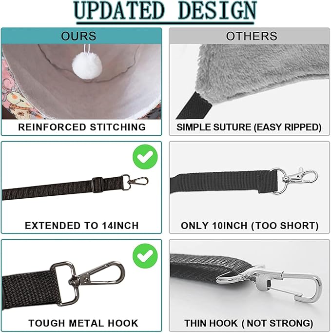 - Exquisite Workmanship & Excellent Stability : We use stronger zinc alloy hooks, which have stronger bearing capacity and can rotate 360°。Reinforced wiring makes the hammock stronger. Exquisite printing process technology, tough metal hooks for better grip, durable stitching technique to combined four straps.NOTE:NOT suitable for SMALL cage. Suitable cage: Please insure the shortest size is more than 22 inch.