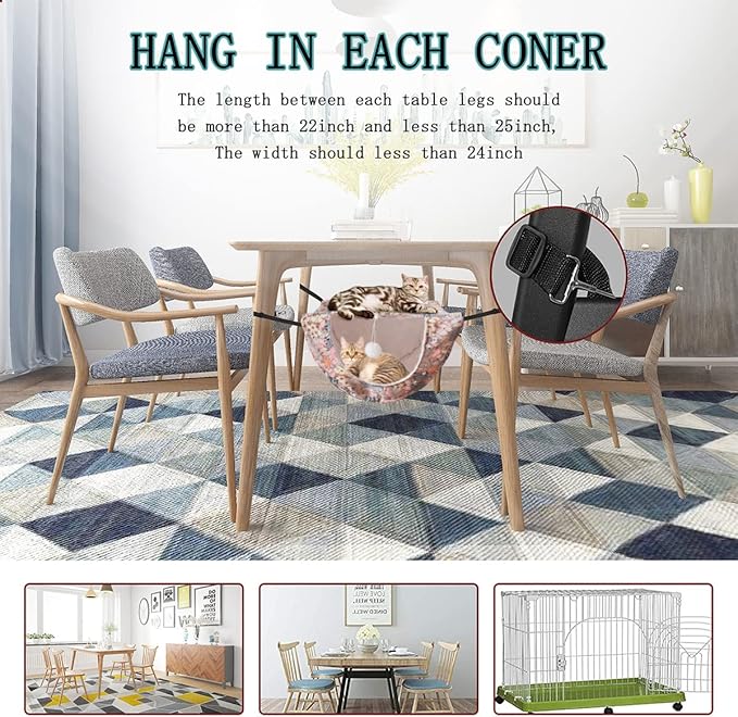 - Multi Occasions Use : Our cat hammock is compatible with cage, table, and chair of different sizes. The adjustable strap could be extended to 14 inches and the stainless steel clips will strongly grab to the cage. It is an ideal product for you to save space. And Cats naturally love to hide in covered spaces.