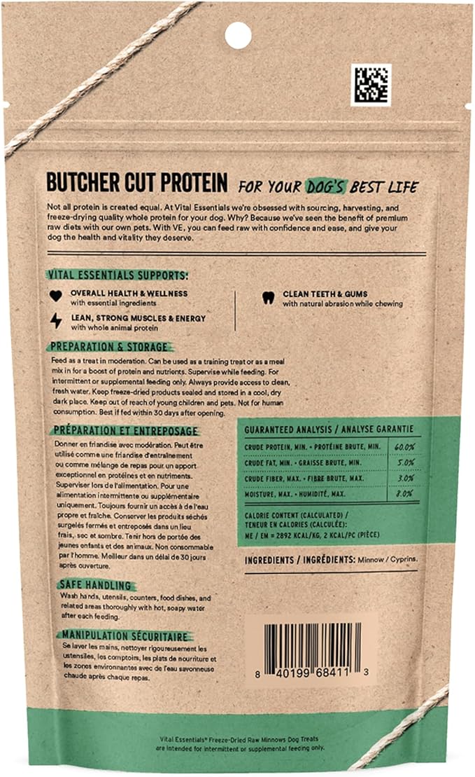 - FREEZE-DRIED RAW MINNOWS DOG TREAT: Vital Essentials Freeze Dried Dog Treats pack more protein than industry standard into every bite to deliver the peak vitality your dog deserves. Our natural freeze-dried raw dog treats are made from responsibly sourced premium minnows.