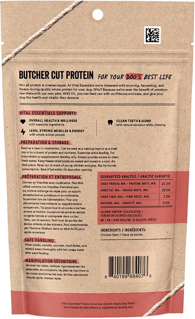 - FREEZE-DRIED RAW CHICKEN HEART DOG TREAT: Vital Essentials Freeze Dried Dog Treats pack more protein than industry standard into every bite to deliver the peak vitality your dog deserves. Our natural freeze-dried raw dog treats are made from responsibly sourced, premium butcher cut chicken hearts.