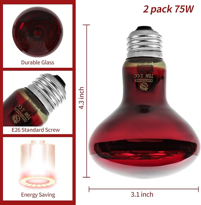 Reptile Heat Lamp Bulbs, Infrared 75W Reptiles & Amphibians Basking Spot Lamp Bulb-2 PCS, Red Heat Emitter Light for Chickens Coop