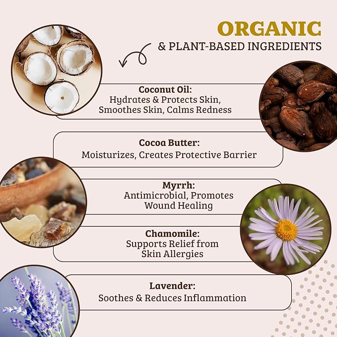- Natural Oils & Butters – Coconut oil, cocoa butter, jojoba, sweet almond, and safflower oils restore moisture and softness.